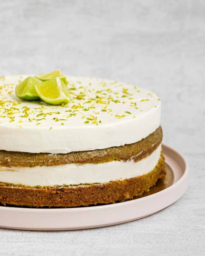 Состав: цедра лайма, сок лайма, цедра лимона, сок лимона, шпинат, сахар, мука, яйцо, растительное масло, разрыхлитель, кунжут, белый шоколад, вафельная крошка, сливки 33%, крем чиз, сахарная пудра.